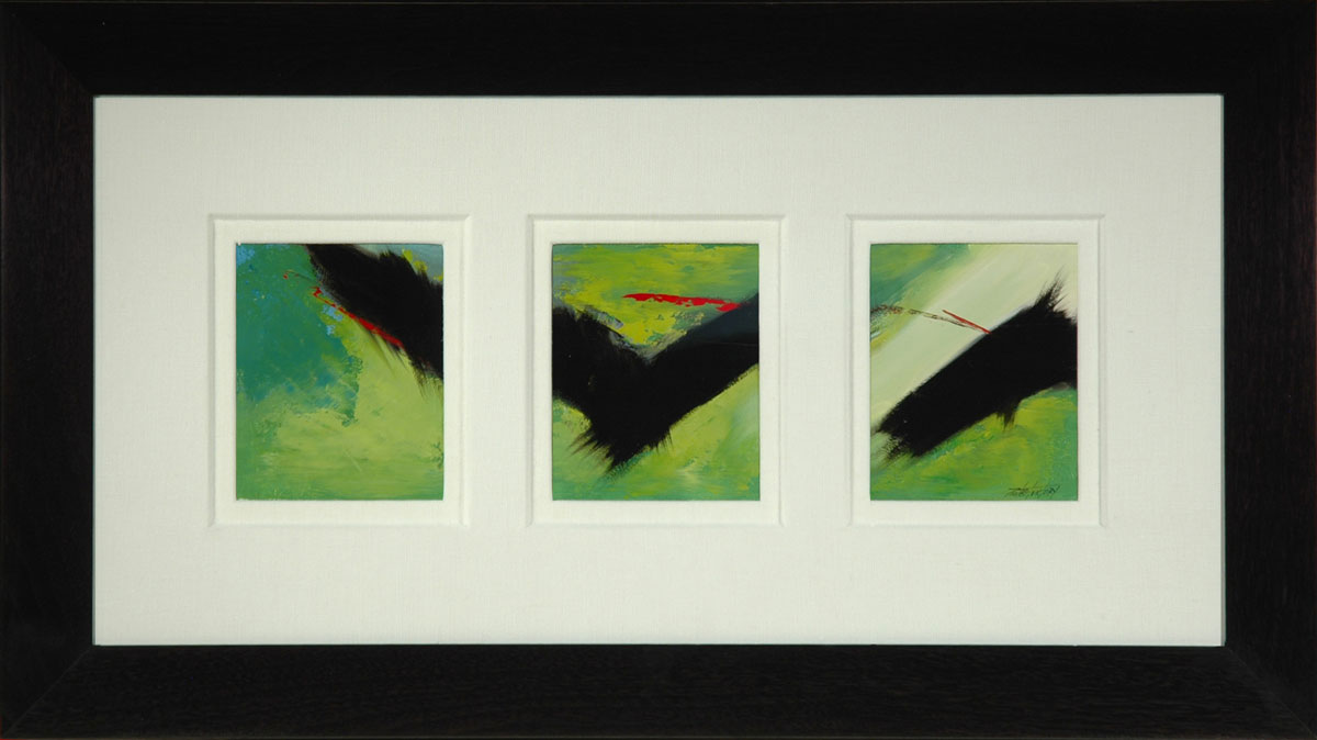 Previous ImageNext Image In_Midst_of_Green In Midst Of Green 16.5″ x 30.25″ • Oil • Sold Green black red abstract triptych