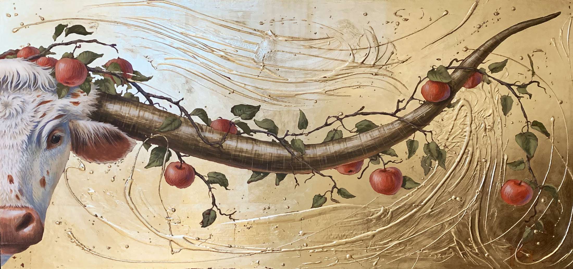 Previous ImageNext Image LONGHORN APPLE GARDEN Longhorn Apple Garden23″ x 46.5″ • Egg Tempera on Panel • $6,300
